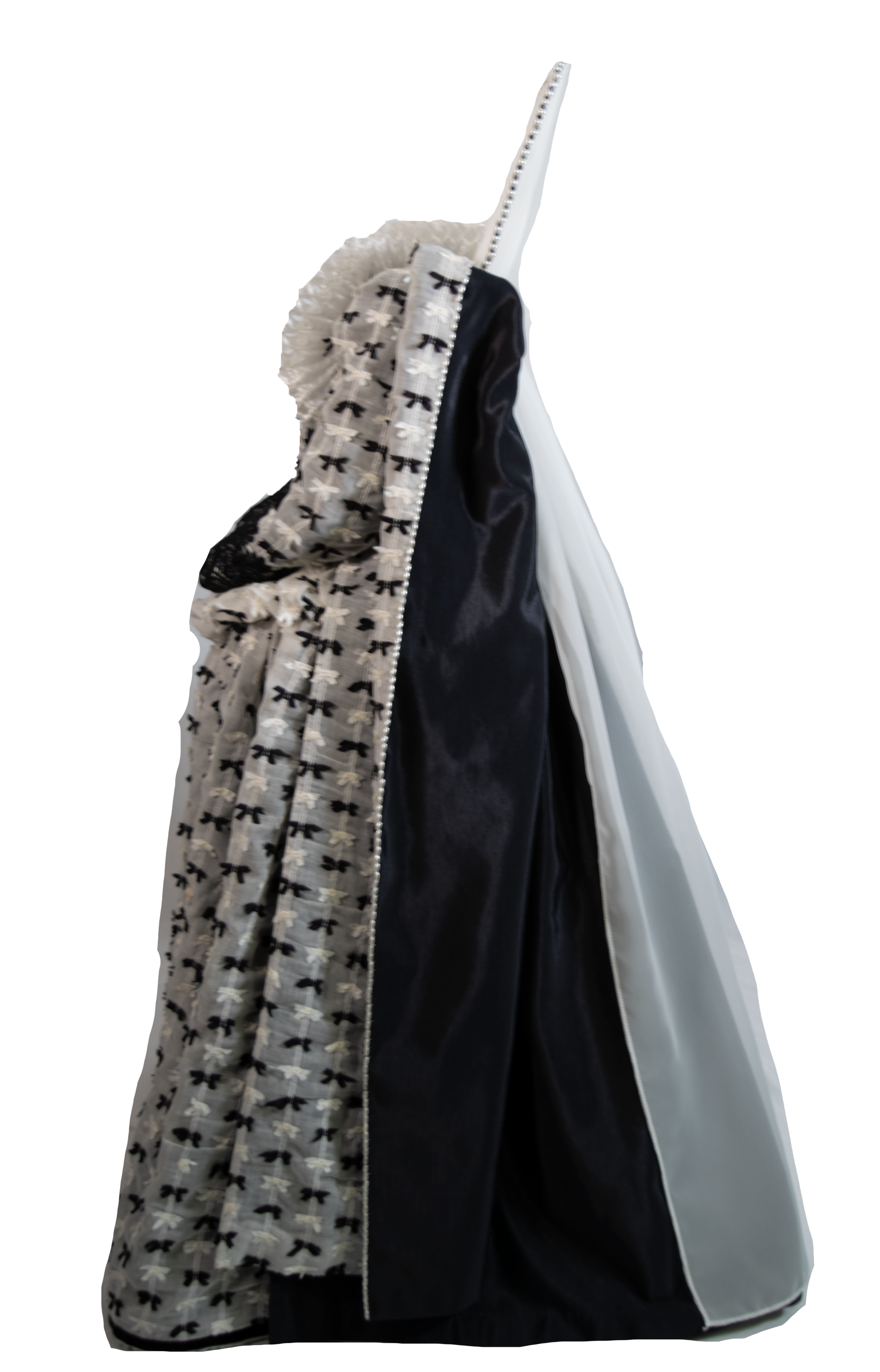 Worn over a French or “cartwheel” farthingale, bumroll, and petticoat for skirt support. Inspired by the Ditchley portrait of Queen Elizabeth I.